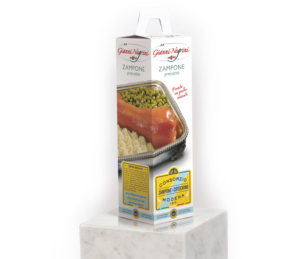 Zampone di Modena IGP tiene la forma típica de la pata delantera del cerdo, compuesta de carne y corteza de cerdo seleccionadas, mezcladas por expertos. Tiene un sabor y aroma muy aromático e intenso, el sabor típico de Emilia.